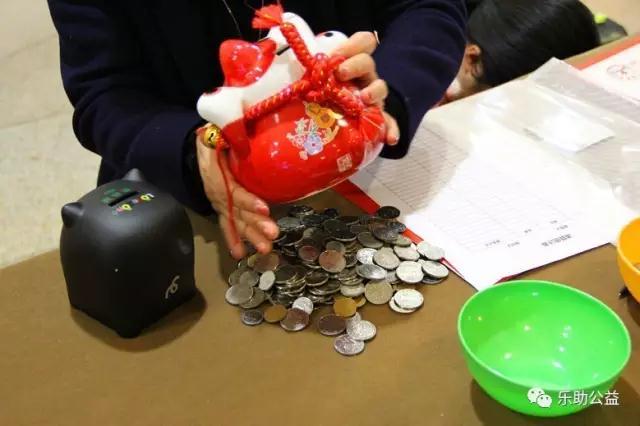 “叮叮叮叮叮”,远远地就能听到清脆的硬币声,一凑近,你就会发现有许多市民正在打开自己领养的“乐助猪”储蓄罐,倒着猪肚子里面的硬币。可别小看了这些钱,一年下来,真的是笔不小的积攒,尤其现场前前后后有数百位领养人光临,每个人都全额捐赠出自己的硬币积蓄!