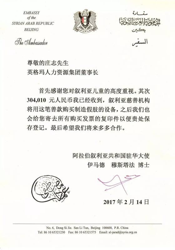 去年1月1日,叙利亚驻华大使伊马德•穆斯塔法(Imad Moustapha)先生亲自来到“第五届乐助慈善公益嘉年华”的现场,接受了第一笔捐赠304010元。这是自去年12月初,乐助慈善基金会携手叙利亚驻华大使馆共同发起“心系叙利亚”主题公益活动以来,由9家爱心企业,120多位爱心个人共同捐助的善款。(新闻回顾:资讯 | 因爱而来,为爱呐喊——叙利亚驻华大使出席乐助慈善公益嘉年华)