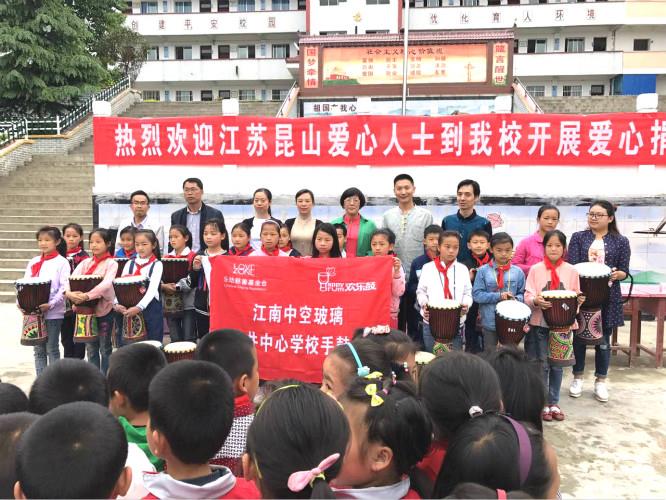 当天,欢乐鼓项目负责人司长城先生代表昆山江南中空玻璃有限公司的爱心企业家钱国良先生和石秋华女士向贵州双井中心小学捐赠了20只手鼓,贵州双井学校“江南中空玻璃”手鼓队在全校师生的见证下正式成立。
