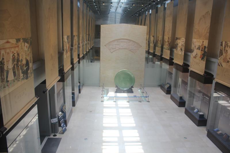 走进展馆大厅,我们首先看到的是地面上印刻着许多千姿百态的“善”字,共有365个,寓意“日行一善”。随后,一块巨大的绿色瓷盘映入眼帘。