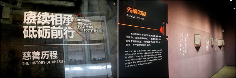 整个博览馆馆内陈列分为慈善思想、慈善历程、慈善组织、慈善人物、当代中国慈善事业、港澳台及海外华人慈善事业六个板块。梳理了从先秦时期慈善萌芽开始至今的中华慈善发展历程,向人们徐徐展开一幅漫长的慈善历史画卷。