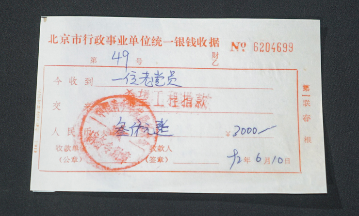 邓小平当年给希望工程的捐款票据,署名为“一位老党员”