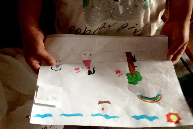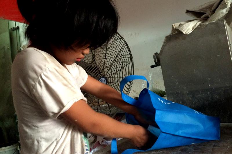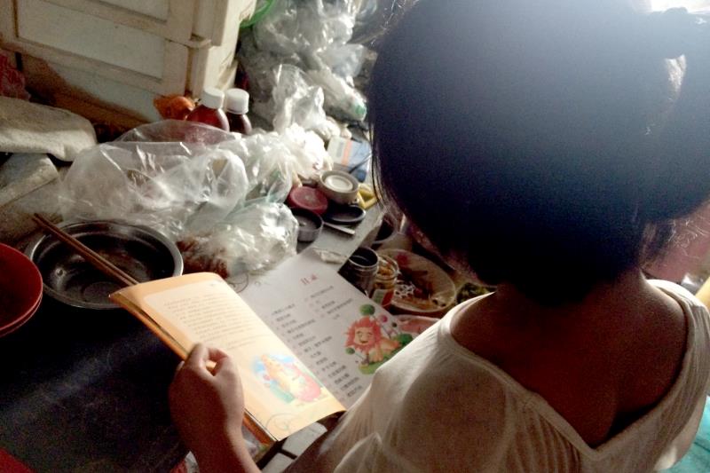 燥热的夏天,小烧饼店内闷热无比。基金会的同事和志愿者还在跟风铃的姑姑聊着风铃的情况。我看到小风铃拿着装书的布兜走进了小隔间,就跟着她进去。