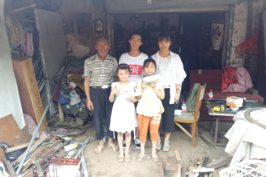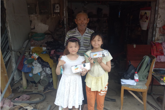 我们给孩子们带去了笔袋和铅笔等学习用品,小姐俩非常腼腆,不好意思拿。爷爷十分感激我们,并教育小姐俩要说感谢。小星和小娟认真又害羞地对我们说了声“谢谢”后开心地把文具抱在了怀里。