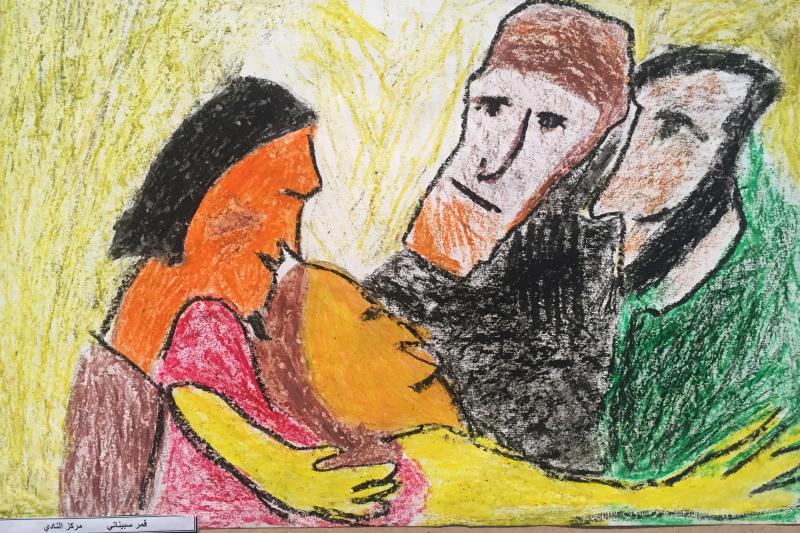 离开大马士革青少年文体活动中心之前,一幅叙利亚儿童的画作引发了大家的感触,似乎在描绘着家人受伤后悲伤情景