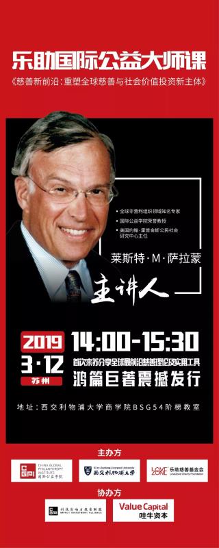 3月12日下午,国际公益学院联合乐助慈善基金会、科技影响力投资联盟、哇牛资本在西交利物浦大学开启2019年乐助首期慈善公益大师课,特邀美国约翰·霍普金斯大学公民社会研究中心主任莱斯特·M.萨拉蒙(Lester M.Salamon)教授作《慈善新前沿:重塑全球慈善与社会投资的新主体和新工具指南》国内新书首发分享,同时在现场为大家打开一个全新的公益视角。