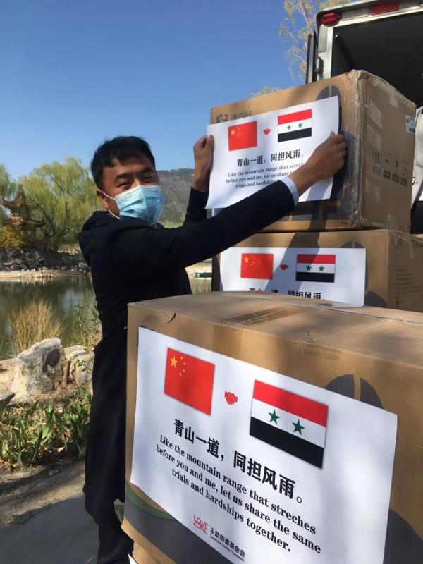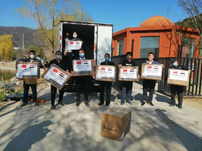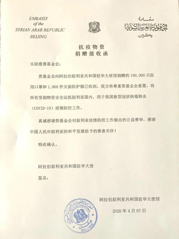 4月3日,乐助慈善基金会工作人员赶赴北京,将首批援助叙利亚抗疫医疗物资(包括10万个一次性医用防护口罩、1000件辐射灭菌防护服)安全运送到了叙利亚驻华大使馆。