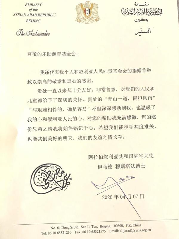 关注到叙利亚的严峻现状后,乐助慈善基金会第一时间展开行动,发出筹款公告,并积极联系【叙利亚驻华大使馆】了解抗疫物资需求和运输通道。